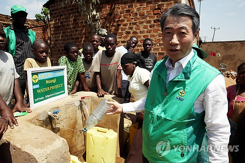 | △ 우간다 새마을운동 시범마을 방문한 정종섭 장관 (서울=연합뉴스) 정종섭 행정자치부 장관이 21일(현지시간) 우간다 수도 캄팔라에 위치한 '카테레케' 새마을운동 시범마을을 방문해 마을 주민들이 공동으로 사용하는 우물에서 양동이에 물을 받아보고 있다. 2015.3.22 << 행정자치부 제공 >> photo@yna.co.kr |