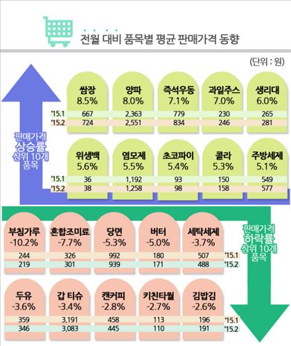 (서울=연합뉴스) 김아람 기자 = 올해 2월 주요 생필품 평균 판매가격이 전월보다 0.9% 올랐다.