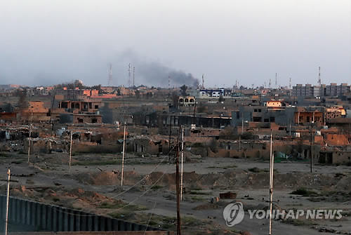 | △ 이라크 군과 수니파 극단주의 무장세력 '이슬람국가'(IS)와의 치열한 전투가 벌어지고 있는 티크리트 시내 카디시야 지역에서 지난 15일(현지시간) 연기가 피어오르고 있다. (AP=연합뉴스) |