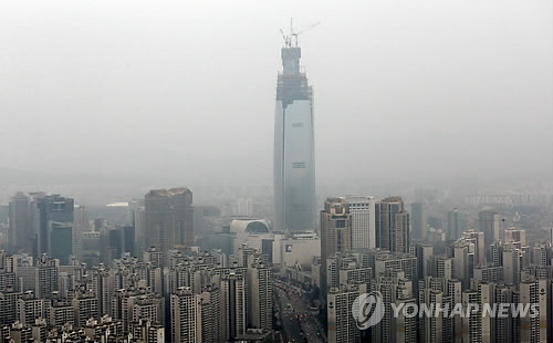 | △ 안개 속에 제2롯데월드 (서울=연합뉴스) 윤동진 기자 = 17일 오후 경찰청 귀성길 점검 헬기에서 바라본 서울 송파구 제2롯데월드 주변에 안개가 가득하다. 2015.2.17 mon@yna.co.kr |