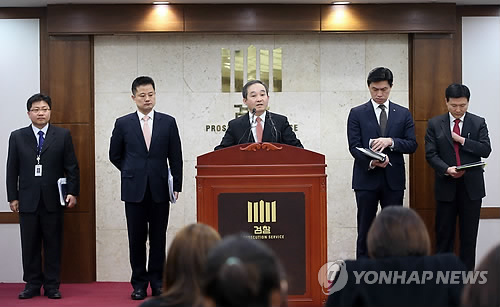 | △ 브리핑하는 이흥락 공보담당관 차장검사 (서울=연합뉴스) 박동주 기자 = 서울서부지검 식품의약조사부는 최근 3년간 검사 규정을 지키지 않고 각종 수법으로 시험성적서를 허위로 발급한 혐의(식품·의약품 분야 시험·검사 등에 관한 법률 위반)로 민간 식품위생검사기관 10곳을 적발, 각 기관의 대표이사와 법인 및 연구원 8명을 구속기소하고 26명을 불구속 기소했다고 23일 밝혔다. 이날 오전 서울 서부지방검찰청에서 이흥락 공보담당관 차장검사(가운데)가 관련 내용을 발표하고 있다. 2015.3.23 pdj6635@yna.co.kr |