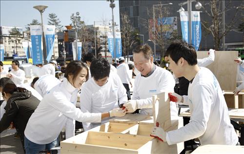 국내에서는 두산 본사가 있는 서울 두산타워 앞 광장에서 박용만 두산그룹 회장을 비롯한 임직원이 저소득층 가정에 보낼 가구를 직접 제작하는 행사가 열렸다.
