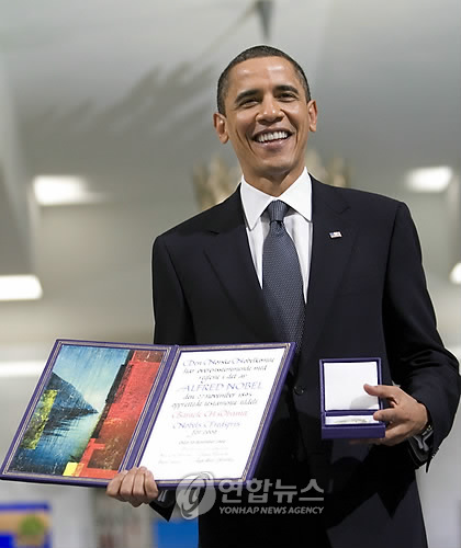 | △ 버락 오바마 미국 대통령이 지난 2009년 12월 10일 노르웨이 오슬로 시청에서 열린 노벨 평화상 수상식에서 토르비에르 야글란 노벨 위원회 위원장으로부터 상을 받고 기뻐하는 모습.<<연합뉴스DB>> |