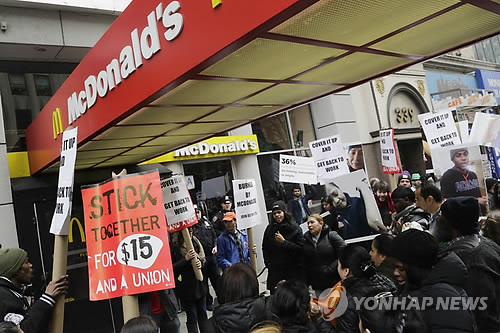 | △ 맥도날드 매장 앞에서 '시급 15달러 쟁취 투쟁'을 벌이는 패스트푸드 종업원들 (AP=연합뉴스) |