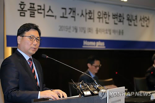 | △ 도성환 홈플러스 사장 기자간담회 (서울=연합뉴스) 이정훈 기자 = 도성환 홈플러스 사장이 10일 서울 중구 소공로 더 플라자호텔에서 기자 간담회를 열고 가격, 품질, 매장, 서비스 등에 대한 홈플러스 4대 혁신안을 발표하고 있다. 2015.3.10 uwg806@yna.co.kr |