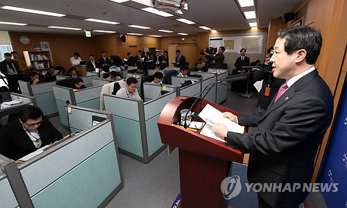 | △ 기자간담회 갖는 유기준 해양수산부 장관 (세종=연합뉴스) 배재만 기자 = 유기준 해양수산부 장관이 24일 오전 정부세종청사 해수부 기자실에서 취임후 처음으로 가진 기자간담회에서 기자들의 질문에 답하고 있다. |