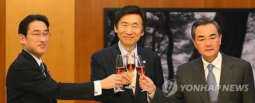 | △ 윤병세 외교부 장관(가운데)이 2015년 3월 21일 오후 서울 용산구 한남동 외교장관 공관에서 열린 한중일 외교장관 만찬에서 왕이 중국 외교부장(오른쪽), 기시다 후미오 일본 외무상과 함께 건배를 하고 있다. |