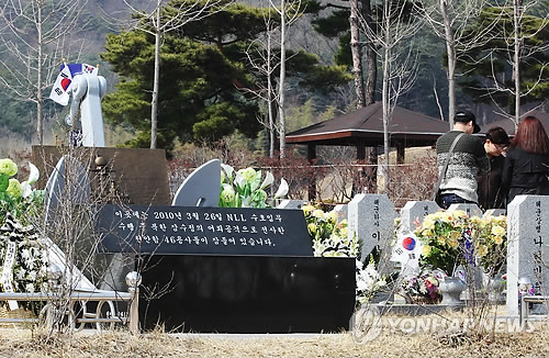 | △ 천안함 묘역 참배 (대전=연합뉴스) 이재림 기자 = 천안함 피격 사건 5주년을 나흘 앞둔 22일 대전 유성구 국립대전현충원 '천안함 46 용사' 묘역에 시민들이 찾아 고인을 참배하고서 묘소 주변에서 이야기를 나누고 있다. 2015.3.22 walden@yna.co.kr |