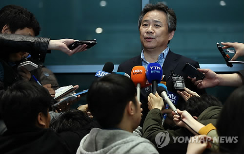 | △ 질문 답하는 이기흥 수영연맹 회장 (영종도=연합뉴스) 이지은 기자 = 이기흥 대한수영연맹 회장이 국제수영연맹(FINA) 도핑위원회 청문회를 마치고 26일 오전 인천공항을 통해 귀국한 후 취재진 질문에 답하고 있다. 이 회장과 수영연맹 관계자들은 금지약물 검사에서 양성반응이 나타난 박태환을 돕기 위해 함께 청문회에 참석했다. 박태환은 국제수영연맹으로부터 18개월 선수 자격정지 징계를 받았다. |