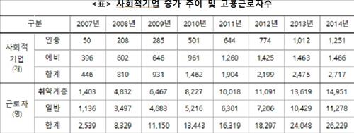이날 주제 발표에 나선 고경환 한국보건사회연구원 연구위원에 따르면 고용노동부 인증을 받은 사회적기업 수는 2007년 50개에서 2014년 1천251개로 25배 늘었고, 근로자 수는 2천500여명에서 2만6천여명으로 10배 넘게 증가했다.