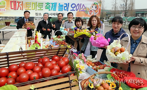 | △ (부산=연합뉴스) 조정호 기자 = 지난해 부산 대저토마토축제를 앞두고 대저농협 직원들이 토마토 홍보를 하고 있다. 2014.4.3. ccho@yna.co.kr |