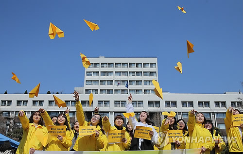 | △ 24개 대학 동시다발 수요시위 (서울=연합뉴스) 이정훈 기자 = 평화나비 서포터즈 숙명여대 학생들이 25일 오전 서울 용산구 청파로 숙명여자대학교 순현관 앞에서 수요시위를 열고 ‘위안부’ 문제에 대한 진상규명과 책임이행 등 문제해결을 촉구하는 퍼포먼스를 하고 있다. 평화나비 네트워크는 한국정신대문제대책협의회의 1171차 수요시위에 맞춰 이날 전국 24개 대학에서 동시다발적으로 수요시위를 진행했다. 2015.3.25 uwg806@yna.co.kr |