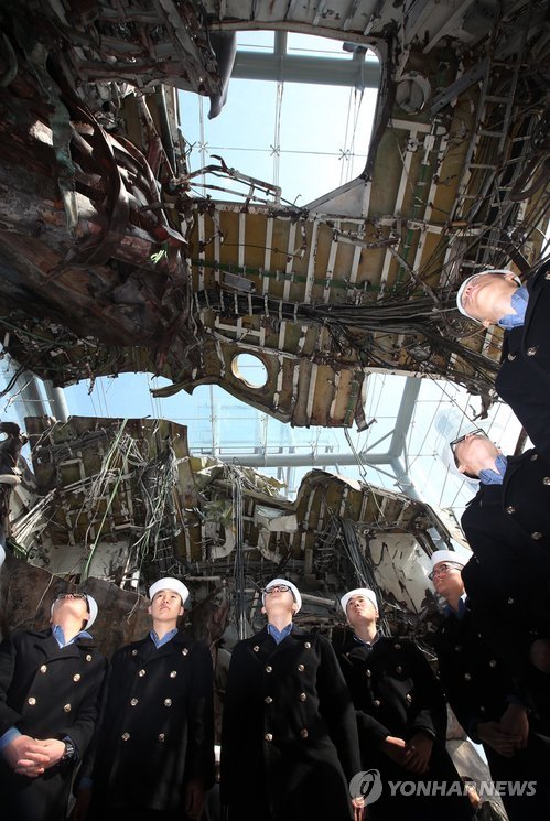 | △ 천안함 바라보는 해군 장병들 (평택=연합뉴스) 신영근 기자 = 천안함 사건 5주년을 일주일 앞둔 19일 오전 해군 장병들이 경기도 평택 해군 제2함대 사령부에 전시된 피격 천안함을 살펴보며 조국 수호 의지를 다지고 있다. 2015.3.19 drops@yna.co.kr http://blog.yonhapnews.co.kr/geenang |