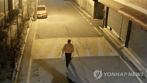 | △ 월세 독촉 노부부 살해하려 한 세입자 (동두천=연합뉴스) 경기 동두천경찰서는 자신에게 월세를 독촉하는 노부부 집에 불을 질러 살해하려 한 세입자를 구속했다고 26일 밝혔다. 사진은 세입자가 지난 16일 범행 전 기름통을 들고 이동하는 모습이 CCTV에 포착된 모습. 2015.3.26 <<동두천경찰서>> suki@yna.co.kr |