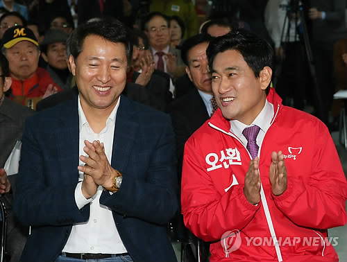 | △ 대화하는 오세훈 전 서울시장과 오신환 후보 (서울=연합뉴스) 진성철 기자 = 4·29 재보궐선거 서울 관악을에 출마한 새누리당 오신환 국회의원 예비후보와 오세훈 전 서울시장이 26일 서울 관악구 오 후보 선거사무소에서 열린 선대위 발대식에서 대화하고 있다. 2015.3.26 zjin@yna.co.kr |