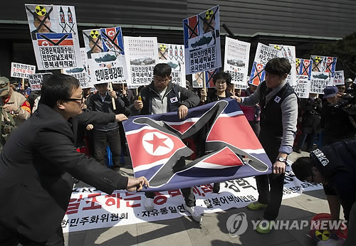 | △ 인공기 찢는 보수단체 회원들 (서울=연합뉴스) 윤동진 기자 = 어버이연합 등 보수단체 회원들이 26일 오후 서울 종로구KT광화문지사 앞에서 열린 천안함 5주기 추모집회에서 천안함 폭침을 날조하는 종북세력 척결을 촉구하며 인공기를 찢고 있다. 2015.3.26 mon@yna.co.kr |