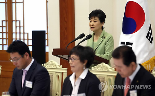 | △ 농축수산단체장들과 간담회 인사말하는 박 대통령 (서울=연합뉴스) 도광환 기자 = 박근혜 대통령이 27일 청와대에서 열린 농축수산단체장들과의 간담회에서 인사말을 하고 있다. |