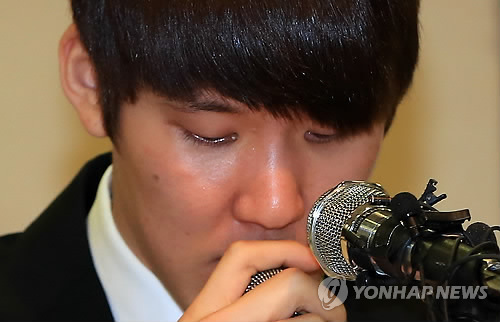 | △ 박태환, 후회의 눈물 (서울=연합뉴스) 홍해인 기자 = 금지약물 양성반응으로 18개월 자격정지 징계를 받은 '수영 스타' 박태환이 27일 오후 서울 송파구 잠실관광호텔에서 열린 기자회견에서 눈가에 눈물이 고인 채 말을 잇지 못하고 있다. 2015.3.27 hihong@yna.co.kr |