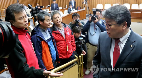 | △ 조원진 공동위원장과 공무원노조 간부 (서울=연합뉴스) 백승렬 기자 = 공무원연금개혁 국민대타협기구 공동위원장인 새누리당 조원진 의원이 27일 국회에서 열린 공무원연금개혁을 위한 국민대타협기구 마지막 전체회의에서 정회를 선언하고 밖으로 나가며 공무원노조 간부 앞을 지나고 있다. |