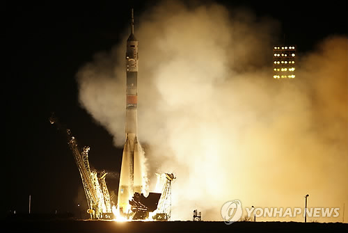 (바이코누르<카자흐스탄> AP=연합뉴스) 미국과 러시아의 우주비행사 3명을 태운 우주왕복선 소유스호가 28일(현지시간) 오전 1시42분(한국시간 28일 오전 4시42분) 카자흐스탄 바이코누르 우주기지에서 발사됐다.