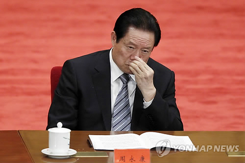 | △ 中 사법·공안 '차르'마저… (AP=연합뉴스) 뇌물 수수와 국가기밀 유출 등 혐의로 6일 체포되고 당적도 박탈된, 저우융캉(周永康, 72) 전 중국 공산당 정치국 상무위원. 2012년 5월4일 베이징 인민대회당의 중국 공산주의청년단 창설 90주년 기념 콘퍼런스에서의 모습이다. 그는 후진타오(胡錦濤) 체제에서 최고지도부 일원인 정치국 상무위원과 공안·사법·정보 분야를 총괄하는 중앙정법위원회 서기를 지낸 인물로, 부패 혐의로 중앙기율검사위원회의 조사를 받아왔다. bulls@yna.co.kr |