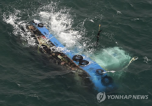 | △ (하코다테<일본 홋카이도> 교도=연합뉴스) 28일 오후 일본 홋카이도(北海道) 하코다테(函館)시 앞바다에 작업용 선박 '제18 메이유(明祐)' 호가 옆으로 누운 채 물에 잠겨 있다. |