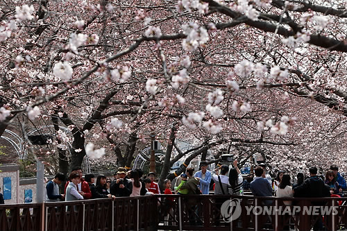 | △ (창원=연합뉴스) 이정훈 기자 = 진해 군항제 개막을 사흘 앞둔 29일 경남 창원시 진해구의 대표적인 벚꽃 군락지인 여좌동 여좌천 일대 벚꽃들이 하나둘씩 개화하기 시작했다. 상춘객들이 활짝 핀 벚꽃 아래를 걷고 있다. 28~29일 사이 개화한 진해지역 벚꽃은 4월 4~5일 사이 절정에 이를 것으로 예상된다. 2015.3.29 seaman@yna.co.kr |