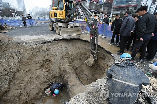 당국은 사고 지점 지하에 묻힌 낡은 상수도관 용접부분이 손상돼 물이 새어 나면서 흙이 쓸려나가는 바람에 지반이 내려앉은 것으로 추정했다.