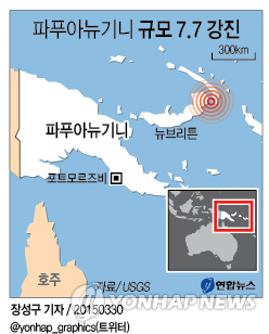 (서울=연합뉴스) 권수현 기자 = 파푸아뉴기니에서 29일(현지시간) 규모 7.7의 강진이 발생, 쓰나미 경보가 발령됐다고 AFP와 신화통신 등이 미국 지질조사국(USGS)을 인용해 보도했다.
