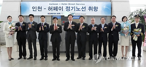 (서울=연합뉴스) 김윤구 기자 = 대한항공[003490]이 30일 오전 인천공항에서 인천∼중국 허페이(合肥) 노선 취항식을 열고 운항을 시작했다.
