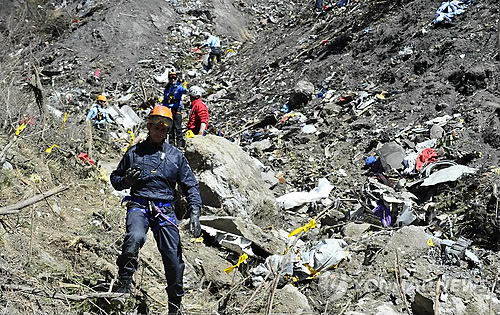 | △ 독일 저먼윙스 여객기 추락 현장인 프랑스 남부 세인 레 잘프스의 알프스 산악에서 24일(현지시간) 프랑스 긴급 구조대가 수색구조 활동에 나서고 있다. (AP/프랑스 내무부=연합뉴스) |