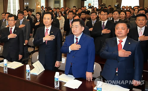| △ 지방자치 20주년 토론회 (서울=연합뉴스) 홍해인 기자 = 30일 오후 서울 태평로 한국프레스센터에서 열린 지방자치 20주년 평가와 개선 방향 토론회에서 지방 4대 협의체 대표를 비롯한 참석자들이 국기에 대한 경례를 하고 있다. 앞줄 왼쪽부터 전국시도지사협의회장 이시종 충북도지사, 전국시도의회의장협의회 이동희 대구시의회 의장, 조충훈 전국시장군수구청장협의회 회장, 심우성 전국시군자치구의회의장협의회 회장. 2015.3.30 hihong@yna.co.kr |