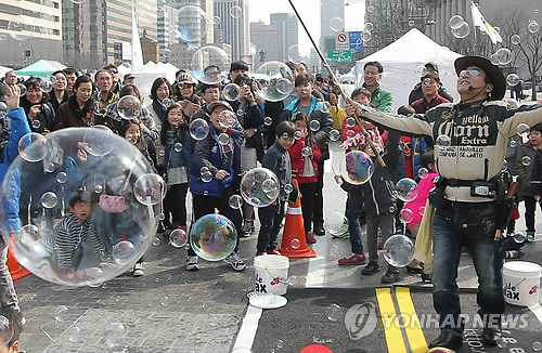 | △ 서울 세종대로에서 올해 처음으로 열린 '보행전용거리 행사'를 찾은 시민들이 거리예술가의 신기한 버블쇼를 구경하고 있다. |
