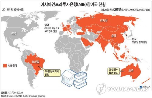 지금까지 중국에 AIIB 가입신청서를 제출한 국가는 한국, 영국, 호주 등 42개국이며 세계 경제 주요국 가운데 미국, 일본, 캐나다만 가입 의사를 밝히지 않았다.