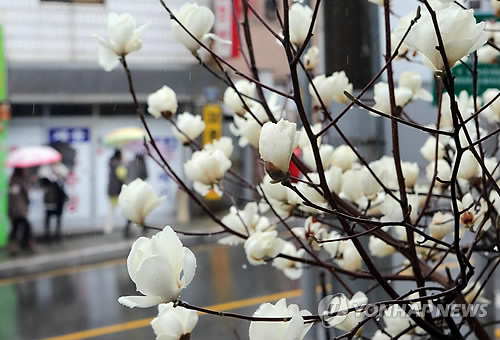 | △ 봄비속에 목련 '활짝' (부산=연합뉴스) 조정호 기자 = 전국적으로 봄을 재촉하는 비가 내린 18일 부산시 해운대구 한 도로변에 목련이 빗물을 머금은 채 꽃망울을 활짝 터뜨려 봄소식을 전하고 있다. 2015.3.18 ccho@yna.co.kr |
