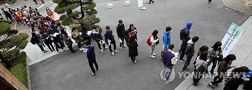 | △ 울산 공공기관 채용설명회장 앞에 늘어선 줄 (울산=연합뉴스) 김용태 기자 = 31일 오후 울산대학교 해송홀에서 열린 '울산지역 혁신도시 이전 공공기관 합동채용설명회'에 참석하기 위해 학생들이 줄을 서서 기다리고 있다. 이날 채용설명회에는 울산혁신도시로 이전한 한국석유공사, 한국동서발전, 근로복지공단, 한국산업인력공단, 안전보건공단, 에너지경제연구원, 에너지관리공단 등 7개 공공기관들이 참가했다. 2015.3.31 yongtae@yna.co.kr |