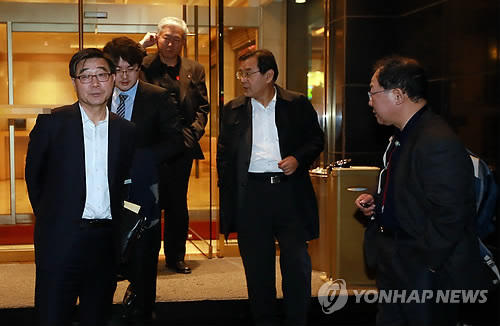 | △ 밖으로 나서는 노사정 대표자 4인 (서울=연합뉴스) 박동주 기자 = 노·사·정이 노동시장 구조개편을 위한 사회적 대타협을 위해 31일 마지막 마라톤협상을 벌였지만 결국 합의 시한을 넘기게 됐다. 1일 오전 서울 시내 모처에서 비공개 회동을 한 이기권 고용노동부 장관, 김동만 한국노총 위원장, 김대환 노사정위원장, 박병원 한국경총 회장 등 노사정 대표자 4인이 밖으로 나서고 있다. |