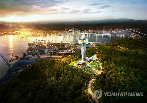 | △ 울산대교 전망대 조감도 (울산=연합뉴스) 다음 달 준공을 앞둔 울산대교 전망대에 경관 조망용 망원경을 설치할지를 놓고 울산시가 고심하고 있다. 사진은 울산대교 전망대 조감도. 2015.4.1 << 울산시 >> yongtae@yna.co.kr |