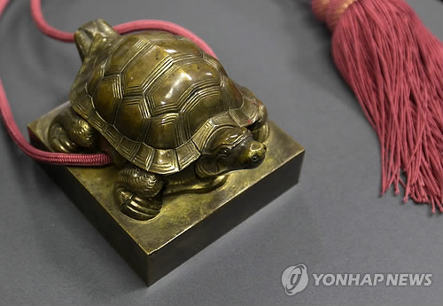 (서울=연합뉴스) 김태식 기자 = 미국 시애틀미술관이 1일 한국 정부에 공식 반환한 조선 덕종어보는 재질이 황동에 금도금이며 무게는 4.45㎏이다. 도장을 찍는 면인 인판(印板)은 가로세로 각각 10㎝.