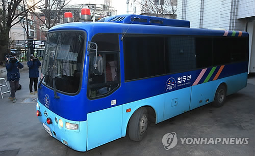 | △ 조현아 징역 1년, 법원 떠나는 호송차 (서울=연합뉴스) 홍해인 기자 = '땅콩 회항' 사건으로 구속 기소된 조현아 대한항공 전 부사장에게 징역 1년의 실형이 선고된 12일 오후 서울 서대문구 서부지방법원에서 호송 버스가 구치감을 떠나고 있다. 2015.2.12 hihong@yna.co.kr |