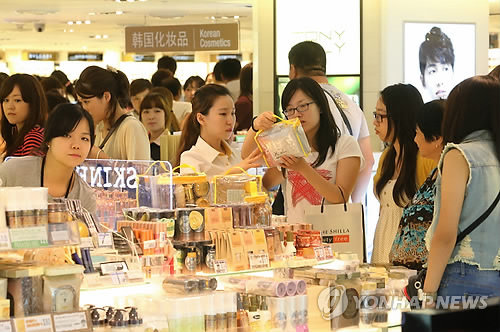 | △ 국내 유명 화장품 매출에서 면세점이 차지하는 비율이 백화점과 방문판매를 처음으로 넘어섰다. 서울 중구 장충동 신라면세점에서 중국인 관광객들이 국산 화장품을 구매하고 있다.(연합뉴스 자료사진) |