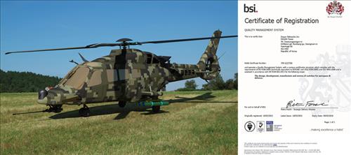 | △ 소형무장헬기 조감도(왼쪽)와 다산네트웍스가 획득한 AS9100 인증서 << 다산네트웍스 제공 >> |