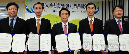 남경필 경기지사, 방문규 기획재정부 2차관, 강형주 대법원 법원행정처 차장, 김주현 법무부 차관, 염태영 수원시장은 2일 도지사 집무실에서 광교신도시 내 법조단지 조성을 위한 '수원고법·수원고검 설치 협약(MOU)'을 맺었다.