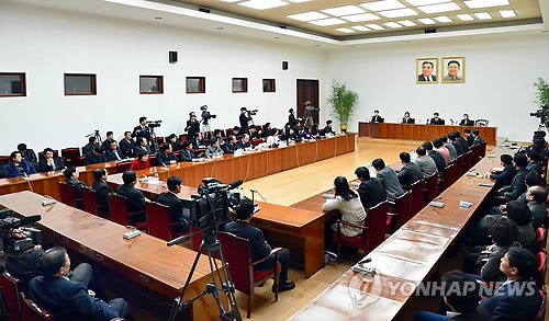 | △ 2013년 1월 재입북한 탈북자들이 평양에서 기자회견을 하는 모습. 2015.4.2 (평양 조선중앙통신=연합뉴스) |