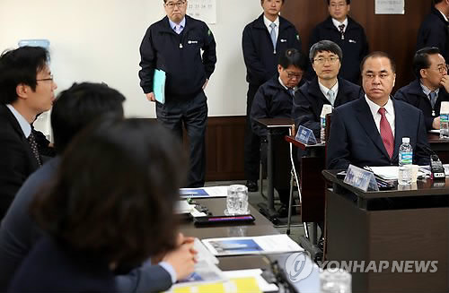 | △ 법원, 경남기업 회생절차 개시 검증 (서울=연합뉴스) 신준희 기자 = 경남기업 장해남 대표(오른쪽)가 2일 오전 회생절차 개시 현장검증을 위해 답십리동 본사를 방문한 서울중앙지법 제25파산부 판사들을 바라보고 있다. 2015.4.2 hama@yna.co.kr |