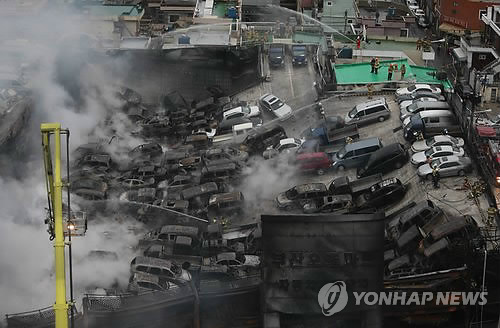 이 불로 3층 규모인 자동차매매단지에 주차돼 있던 중고차 570여 대가 불에 탔다. 인명피해는 없었지만 소방당국 추산 30억원 가량의 재산피해가 났다. 불길이 거세 중고 차량들이 주차된 철골구조물 2, 3층 중앙부가 내려앉았다.