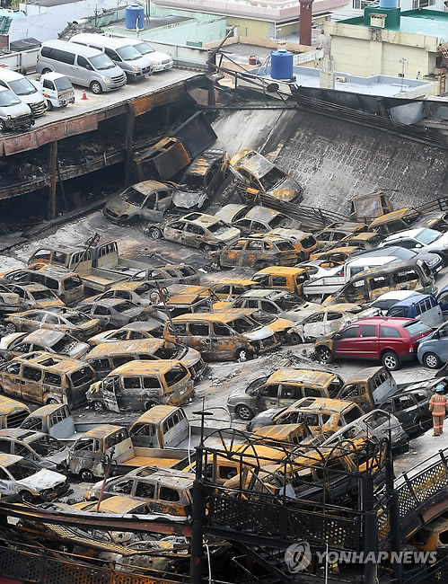 불길이 거세 중고차들이 주차된 철골구조물 2, 3층 중앙부가 내려앉았다.