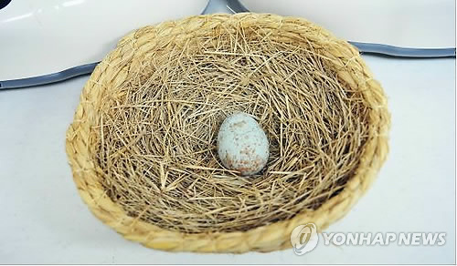 | △ '시진핑 기증' 따오기 올해 첫 산란 성공 (창녕=연합뉴스) 2013년 12월 중국에서 한국으로 장가 온 수컷 따오기가 지난해에 이어 올해도 산란에 성공했다. 사진은 수컷 따오기 '바이스(白石)'와 암컷 따오기 '우포-13'이 지난 6일 오후 6시 15분 경남 창녕군 우포따오기 복원센터에서 산란한 알. 2015.3.8 <<경남도청>> pitbull@yna.co.kr |