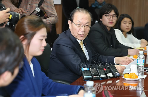 | △ 황우여 사회부총리, 대학생 대표와 간담회 (서울=연합뉴스) 박지호 기자 = 황우여 사회부총리 겸 교육부 장관이 4일 오후 서울 서초구 우면동 한국교육개발원에서 대학생 대표들과 만나 대학구조개혁 등 교육현안을 놓고 의견을 교환하고 있다. 2015.2.4 jihopark@yna.co.kr |