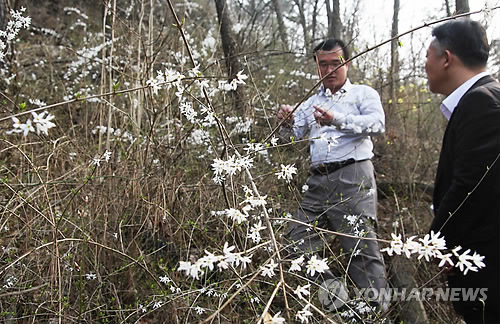 | △ 옥천에 미선나무 꽃 활짝 (옥천=연합뉴스) 충북 옥천군 군서면 월전리의 야산서 자라는 미선나무가 새하얀 꽃을 피웠다. 옥천군은 이 지역 미선나무 보호계획을 세우기 위해 11월까지 생태조사에 나설 예정이다. 2014.4.1 <<옥천군 제공>> bgipark@yna.co.kr |
